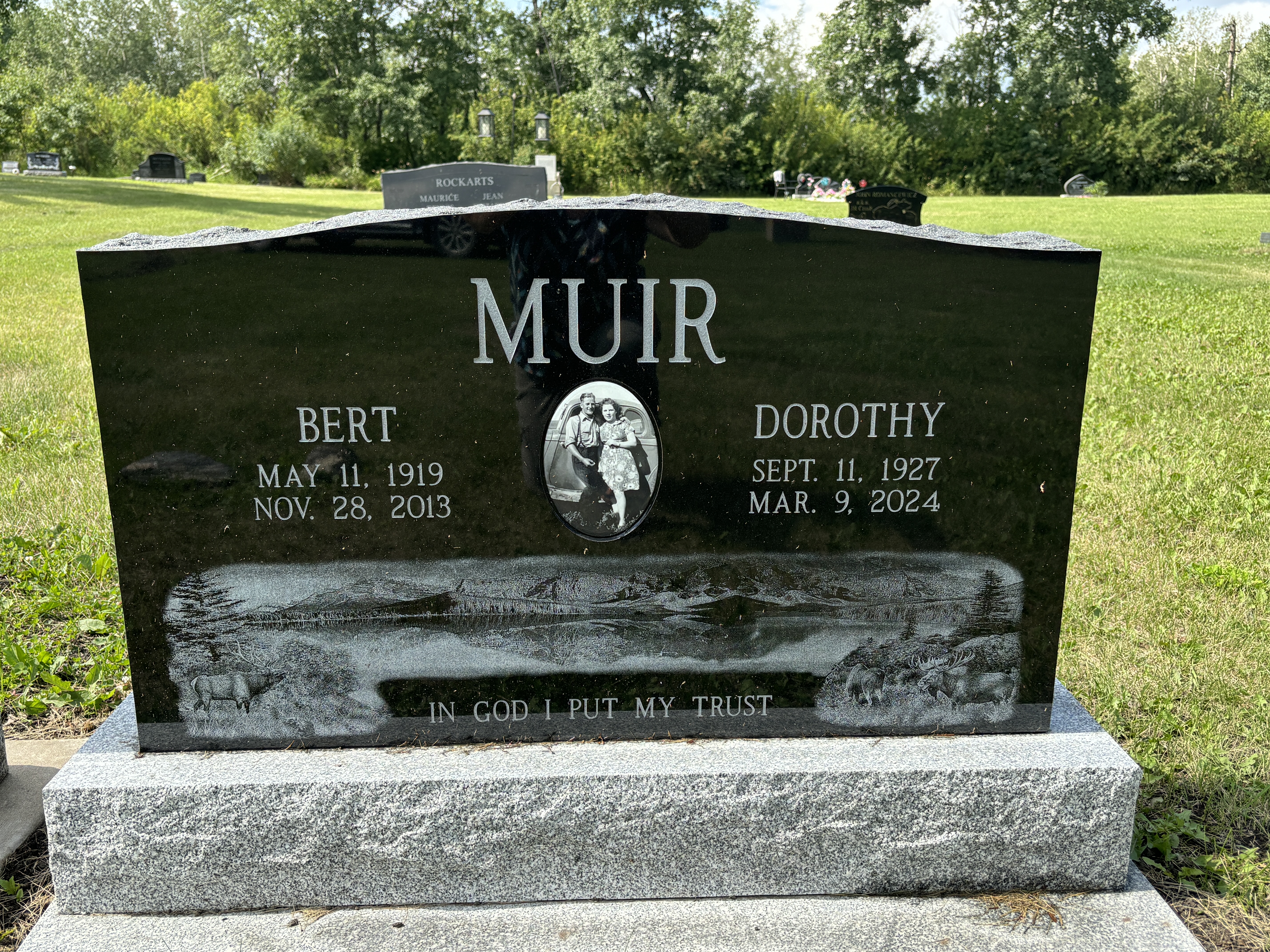 time. She left this world without fear or regret at the age of 96 years.Dorothy was born in Nanton, Alberta on September 11th, 1927, the fourth child of Jim and Madeline Ryan. She married Bert Muir on August 16th, 1947 at the age of twenty and they were married for 66 years until Bert's passing in 2013. Growing up in the Foothills of Alberta on a small ranch, times were hard and at the age of 17, she began a teaching career at a small rural school near Rocky Mountain House. She faced many difficulties as a teenage schoolteacher, but always rose to the challenge. Dorothy and Bert farmed near Nanton, Alberta with their family of four children until 1965 when they sold the farm and moved to Grande Prairie. Here she continued her career as a teacher until retiring in the 1980's. Faith was an integral part of her life and showed in her love for her family and friends. Mom also loved music and was an accomplished fiddle player, competing at several local fiddling contests. For several years she played in a band called Wild Rose Country. Together, she and husband Bert enjoyed hosting family and friends at their acreage in Grande Prairie. Over the years, many people enjoyed their hospitality at birthdays, weddings, anniversaries and other special occasions. Dorothy opened her home and her heart to everyone. She was a friend, a counsellor and an advocate to anyone who reached out for help. And there were many over the years. Moving from the family home to the Wild Rose Manor after her husband Bert's passing in 2013, she continued to cultivate new friendships with the other Wild Rose residents. She also enjoyed playing her fiddle at some of the manor's social events. Dorothy is survived by her sister Mert Sandy, daughter Kendra (George) and son Bruce (Anne), grandchildren Riley (Kristen), Kelly (Mike), Kyla (Mike), Lindsay (Shawn) and Corri, great grandchildren Brett, Brooke, Connor, Cadence, Leo, Georgia, Violet and Hugh as well as numerous nieces and nephews. Dorothy was predeceased by her husband Bert, her parents Jim and Madeline Ryan, siblings Bill Ryan, Pat Ewashen, Doreen Hopkins and Kate Young, son Larry Muir, daughter Linda Edlund, grandchildren Chris Muir and Brady Fournier as well as many other loving and special brother and sister in laws, special family members and friends. A celebration of Dorothy's life will be held on Saturday, April 6th, 2024 at 1pm at Bear Creek Funeral Home (11802 99 Avenue in Grande Prairie, Alberta). Lorraine Raiwet will be officiating, and a luncheon will be served following Dorothy's service. Care entrusted to Bear Creek Funeral Home 780-830-7742 bcfh.ca Published in The Daily Herald-Tribune - March 14, 2024 |